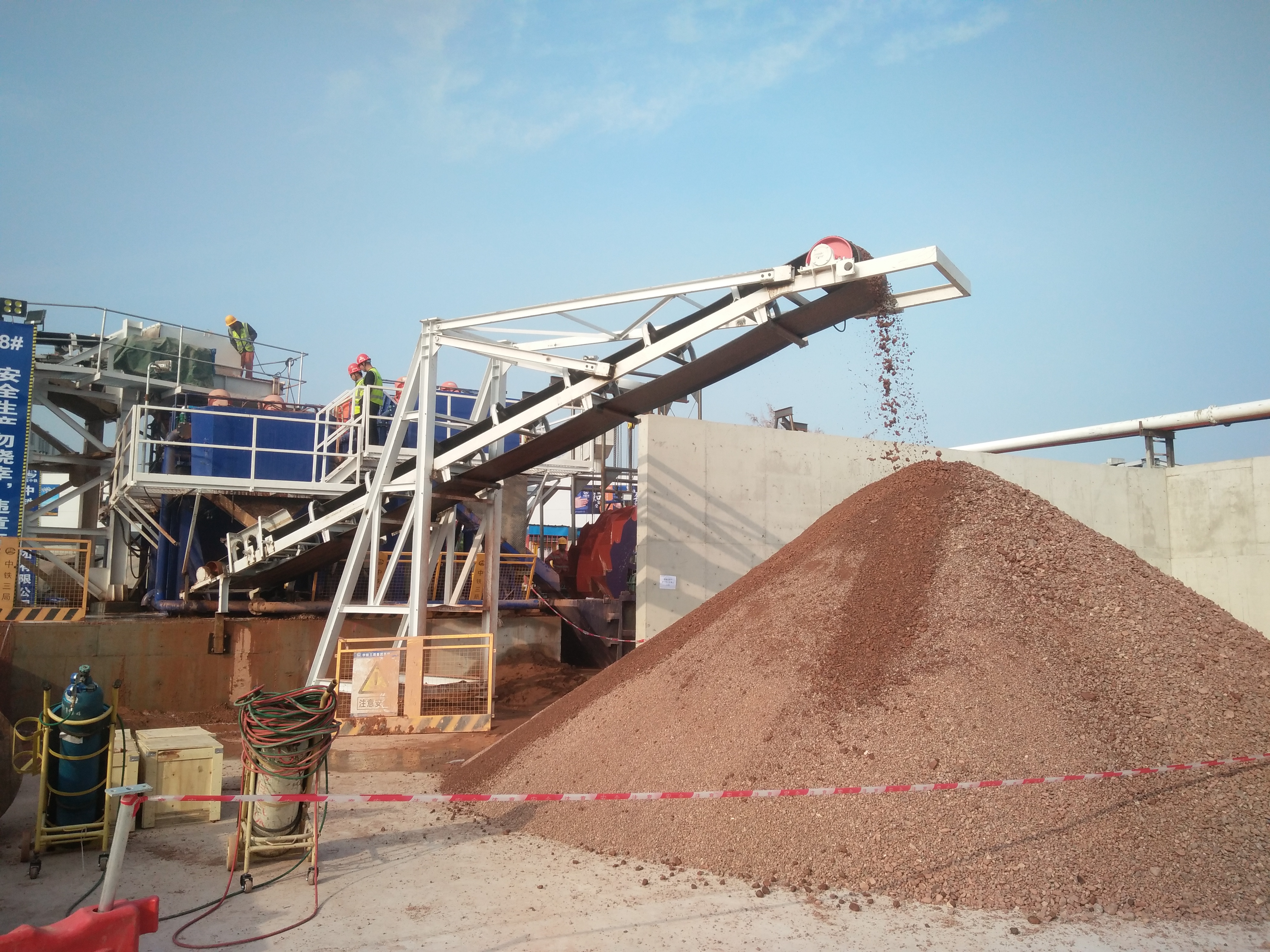 盾構(gòu)渣土處理設(shè)備,包括多重強(qiáng)壓沖水振動(dòng)分離機(jī)、與多重強(qiáng)壓沖水振動(dòng)分離機(jī)連接的絞籠泥漿分離機(jī)、通過(guò)第一泥漿泵將絞籠泥漿分離機(jī)排出的泥漿輸送至泥漿池的導(dǎo)流槽或管、與導(dǎo)流槽或管連接的泥漿池、通過(guò)第二泥漿泵將泥漿池中的泥漿輸送至壓濾機(jī)的凹凸型泥漿輸送管、與凹凸型泥漿輸送管連接的壓濾機(jī)。