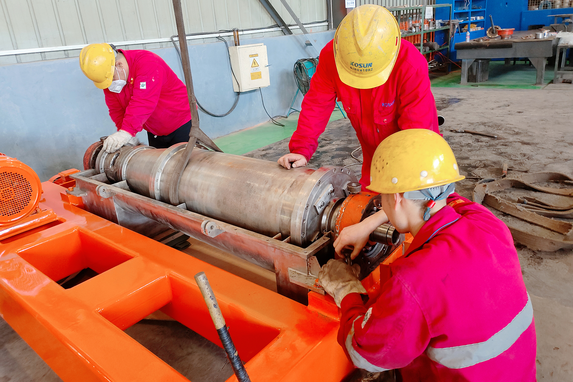 西安科迅(KOSUN)技術團隊在接到客戶報修后,迅速響應并全面檢測,發(fā)現(xiàn)離心機的螺旋推進器軸承磨損嚴重,同時轉鼓動平衡出現(xiàn)偏差,導致設備運行振動增大、分離效率下降。針對這些問題,工程師制定了詳細的維修方案。